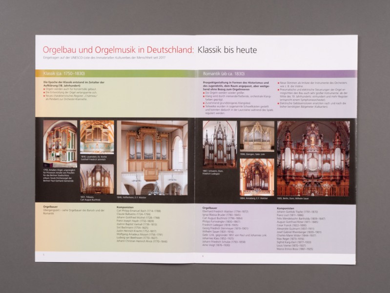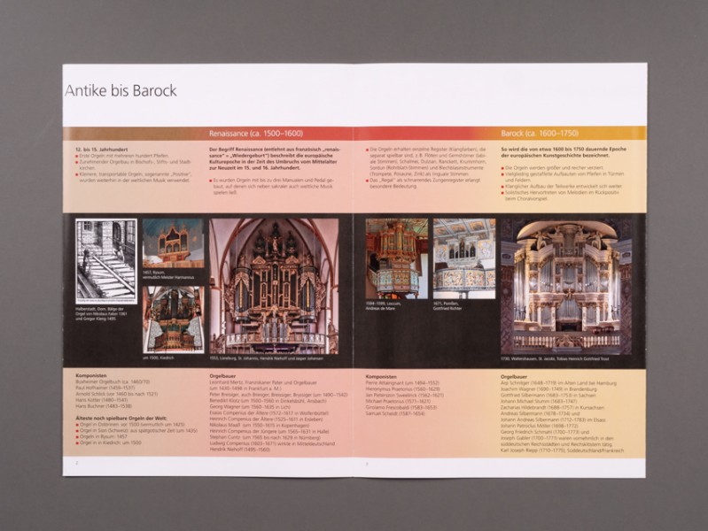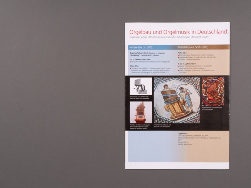 • Entwicklung eines 8-seitigen Folders zur Darstellung der Entwicklung des Kulturguts Orgel von der Antike bis zur Gegenwart. Wenn zwei Folder nebeneinander oder übereinander als Vorder- und Rückseite zum Plakat kombiniert werden, so ist die gesamte Zeitachse auf einen Blick zu sehen.